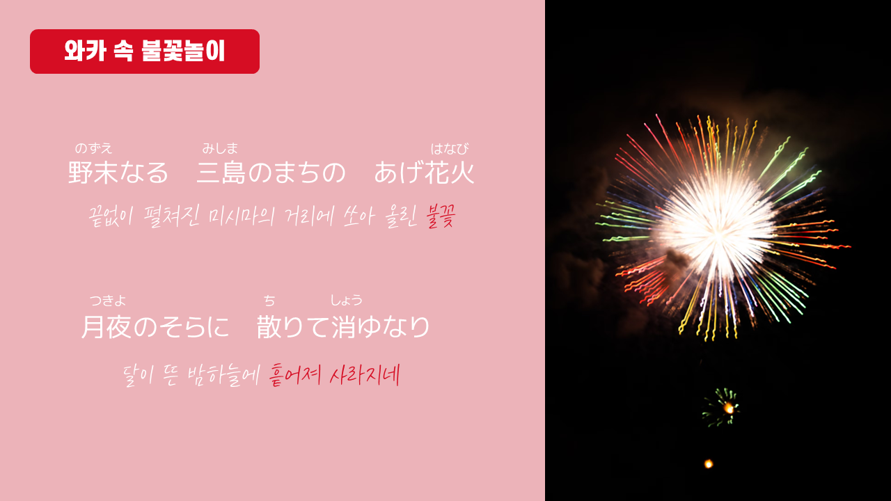 불꽃놀이와 관련된 와카 작품 중 제가 준비한 것은 와카야마 보쿠스이(若山牧水, 1885~1928)라는 시인이 시즈오카현 미시마시에 있는 미시마신사에서 마츠리가 열렸을 당시, 하늘로 쏘아 올린 불꽃놀이를 본 후에 지은 것입니다.