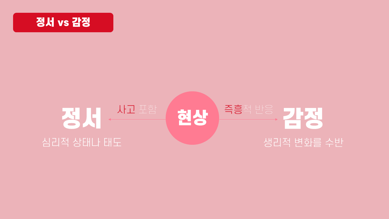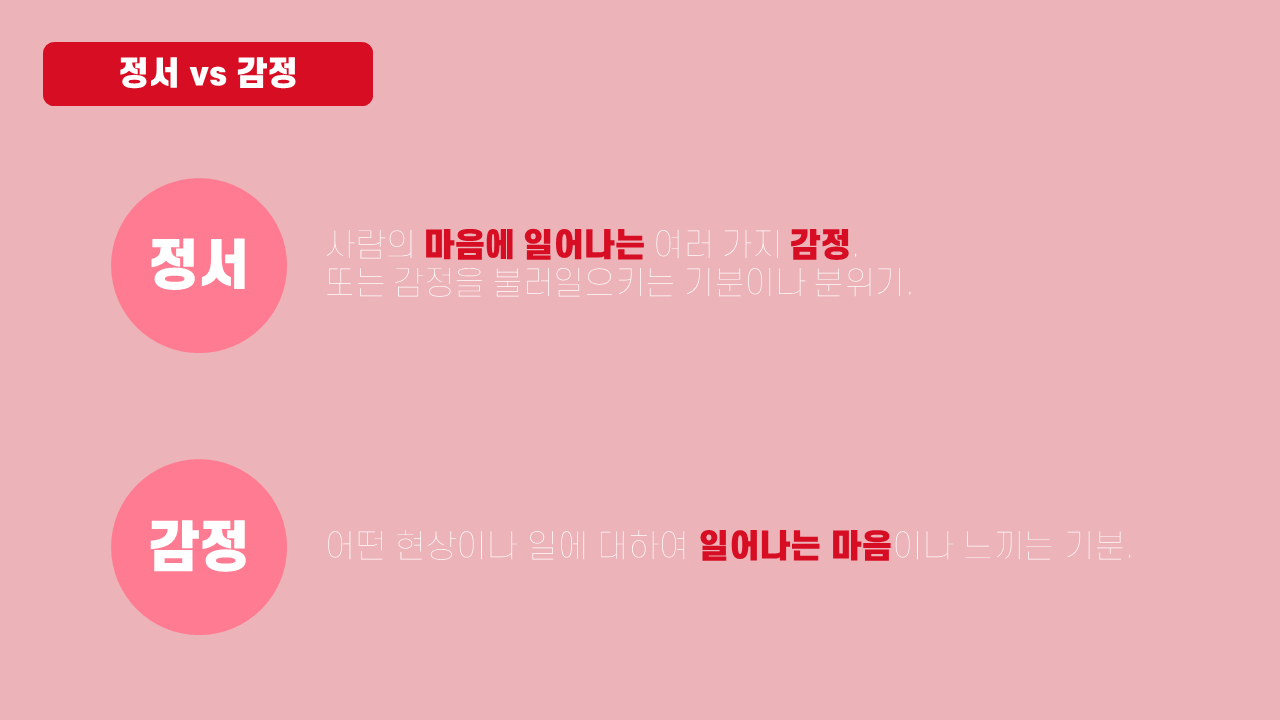 표준국어대사전에서도 정의하고 있는 것처럼 정서와 감정은 어떠한 사물이나 현상을 보고 듣고 느낌으로써 발현된다는 공통점이 있습니다. 하지만 어떠한 방향으로 나아가고 있는지, 또 의식적으로 만들어 내거나 바꿀 수 있는지에서 차이를 보입니다.