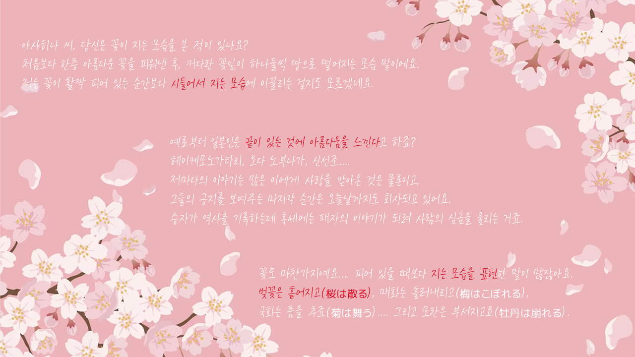 여러분은 끝이 있는 것에 아름다움을 느끼나요? 이를 보통 '덧없음의 미학'이라는 말로 표현하고는 합니다. 일본어로는 덧없음의 미학을 '모노노아와레(物の哀れ)'라고 칭합니다.