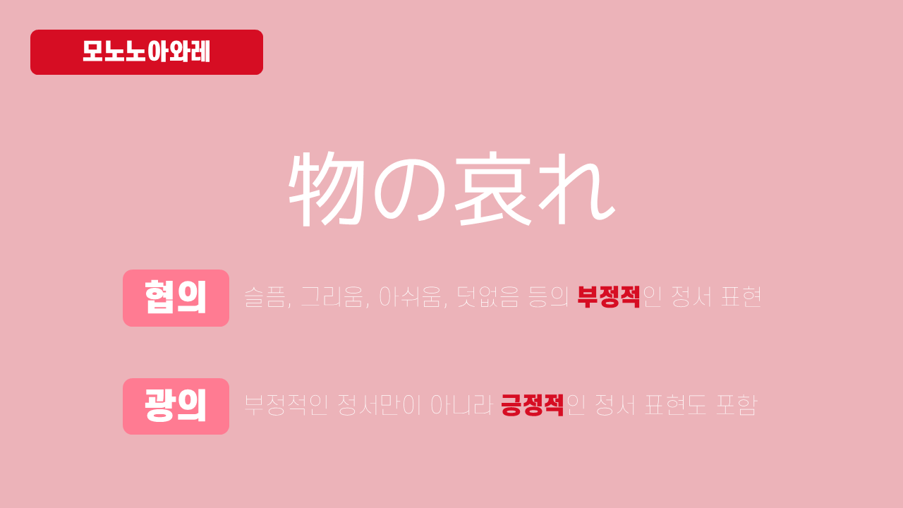 사물의 슬픔이라는 표현처럼 좁은 의미의 모노노아와레는 슬픔, 그리움, 아쉬움, 덧없음을 일컫습니다. 이번에 제가 주로 이야기할 부분이 바로 좁은 의미의 모노노아와레라고 생각해 주면 되겠습니다.