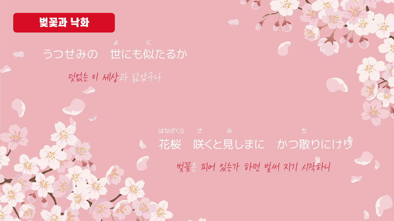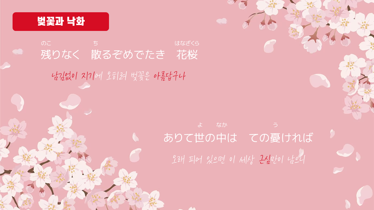 일본인은 활짝 핀 벚꽃을 보며 봄이 온 것을 즐기기도 했지만, 바람이 불어 벚꽃이 지는 모습을 보며 자신의 생각을 시로 표현하기도 했는데요. 『코킨와카슈』 [글쓴이 추가 설명: 古今和歌集. 줄여서 코킨슈(古今集)로 표현하기도 해요]에 실린 오른쪽 이미지의 와카는 벚꽃이 지는 모습을 보고 흥망성쇠하는 세상과 별반 차이가 없다는 것을 느낀 작가의 생각이 담겨 있습니다.